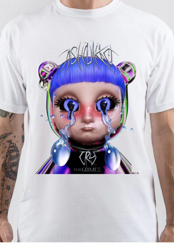 Ashnikko’s world tour tee is a black tee that features a design inspired by her 2020 album, cry, as well as 2021 tour cities on the back.